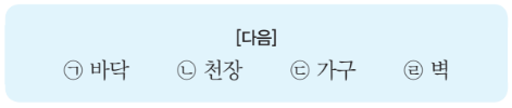 다음과 같은 실내 표면에서 일반적으로 추천반사율의 크기를 맞게 나열한 것은?