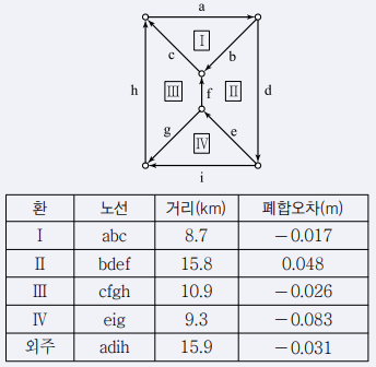 그림과 같은 수준망을 각각의 환에 따라 폐합오차를 구한 결과가 표와 같고 폐합오차의 한계가 ± 1.0\sqrt{S}cm일 때 우선적으로 재 관측할 필요가 있는 노선은?(단, S : 거리[km])