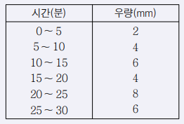 어떤 유역에 다음 표와 같이 30분간 집중호우가 계속 되었을 때, 지속기간 15분인 최대강우강도는?