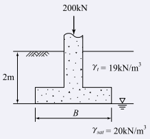 그림과 같은 정사각형 기초에서 안전율을 3으로 할 때 Terzaghi의 공식을 사용하여 지지력을 구하고자 한다. 이때 한 변의 최소길이(B)는? (단, 물의 단위중량은 9.81kN/m³, 점착력(c)은 60kN/m², 내부 마찰각(