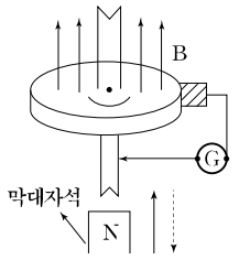 막대자석 위쪽에 동축도체 원판을 놓고 회로의 한 끝은 원판의 주변에 접촉시켜 회전하도록 해 놓은 그림과 같은 패러데이 원판 실험을 할 때 검류계에 전류가 흐르지 않는 경우는?