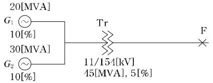용량 30[MVA]의 %임피던스는 자기용량기준으로 각각 10[%], 10[%],이고 변압기 Tr 용량 45[MVA]의 %임피던스 5[%]이다.)