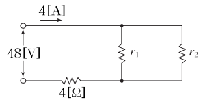 그림과 같은 회로에서 저항 r_1,r_2에 흐르는 전류의 크기가 1 : 2의 비율이라면 r_1,r_2는 각각 몇 [Ω]인가?