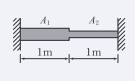 그림과 같이 단면적이 A_1=100cm²이고, A_2=50cm²인 부재가 있다. 부재 양 끝은 고정되어 있고 온도가 10℃내려갔다. 온도저하로 인해 유발되는 단면력은? (단, E=2.1\times10^6kg/cm^2, 선팽창계수(\alpha)=1\times 10^{-5}/ ^{\circ}C)