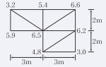 대상구역을 삼각형으로 분할하여 각 교점의 표고를 측량 한 결과가 그림과 같을 때 토공량은?