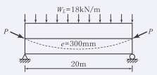 그림과 같이 긴장재를 포물선으로 배치하고 P=2500kN 으로 긴장했을 때 발생하는 등분포 상향력을 등가하중의 개념 으로 구한 값은?