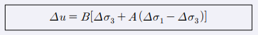 아래 표의 공식은 흙시료에 삼축압축이 작용할 때 흙시료 내부에 발생하는 간극수압을 구하는 공식이다. 이 식에 대한 설명으로 틀린 것은?