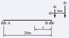 그림과 같이 2개의 집중하중이 단순보 위를 통과할 때 절대최대휨모멘트의 크기(