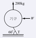 부양력 200kg인 기구가 수평선과 60°각도로 정지상태에 있을 때 기구의 끈에 작용하는 인장력(