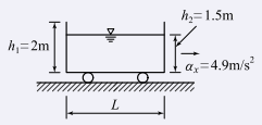 그림과 같이 높이 2m인 물통에 물이 1.5m만큼 담겨져 있다. 물통이 수평으로 4.9m/s²의 일정한 가속도를 받고 있을 때, 물통의 물이 넘쳐흐르지 않기 위한 물통의 길이(L)는?