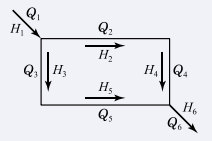 그림은 Hardy-Cross 방법에 의한 배수관망의 도해법이다. 그림에 대한 설명으로 틀린 것은? (단, Q는 유량, H는 손실수두를 의미한다.)
