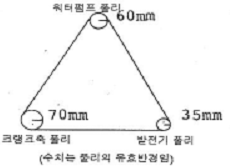 그림에서 크랭크축 풀리의 회전속도가 600rpm일 때 발전기 풀리의 회전속도는? (단, 풀리와 벨트 사이의 미끄럼은 무시한다.)