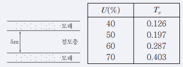 그림과 같은 5m 두께의 포화점토층이 98.1kN/m²의 상재하중에 의하여 30cm의 침하가 발생하는 경우에 압밀도는 약 60%에 해당하는 것으로 추정되었다. 향후 몇 년이면 이 압밀도에 도달하겠는가? (단, 압밀계수(C_u)=3.6×10^{-4}cm^2/sec)