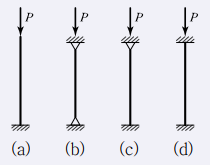 아래 그림과 같은 기둥에서 좌굴하중의 비 (a) : (b) : (c) : (d)는?(단, EI와 기둥의 길이(
