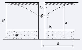 그림과 같은 굴착정(artesian well)의 유량을 구하는 공식은?(단, R : 영향원의 반지름, K : 투수계수, m : 피압대수층의 두께)