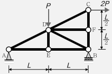 그림과 같은 트러스가 절점 C 및 D에서 하중을 지지하고 있다. 이 트러스에서 부재력이 발생하지 않는 부재는 어느 것인가?