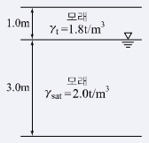 아래 그림과 같은 모래지반에서 깊이 4m 지점에서의 전단강도는? (단, 모래의 내부마찰각
