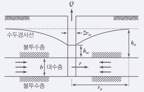 그림과 같이 우물로부터 일정한 양수율로 양수를 하여 우물 속의 수위가 일정하게 유지되고 있다. 대수층은 균질하며 지하수의 흐름은 우물을 향한 방사상 정상류라 할 때 양수율(