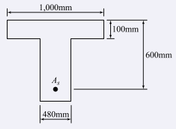 b_e=1,000mm, b_w=480mm, t_f=100mm, d=600mm, A_s=14-D25=7,094mm^2, f_{ck}=21MPa, f_y=300MPa