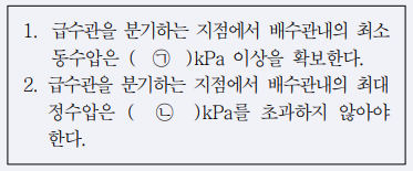 배수관의 수압에 관한 사항으로 ㉠, ㉡에 들어갈 적정한 값은?