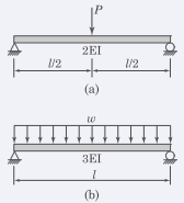 그림 (a)와 (b)의 중앙점의 처짐이 같아지도록 그림(b)의 등분포하중 w를 그림 (a)의 하중 P의 함수로 나타내면 얼마인가? (단, 재료는 같다.)