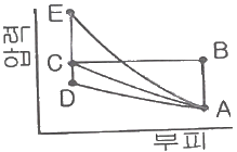 그림에서 이상기체를 A에서 가역적으로 단열압축시킨 후 정적과정으로 C까지 냉각시키는 과정에 해당되는 것은?