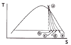 증기터빈에서 상태 ⓐ의 증기를 규정된 압력까지 단열에 가깝게 팽창 시켰다. 이 때 증기터빈 출구에서의 증기 상태는 그림의 각각 ⓑ, ⓒ, ⓓ, ⓔ이다. 이 중 터빈의 효율이 가장 좋을 때 출구의 증기 상태로 옳은 것은?