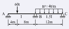 연속보를 삼연모멘트 방정식을 이용하여 B점의 모멘트 M_B=-92.8t \cdot m을 구하였다. B점의 수직반력은?