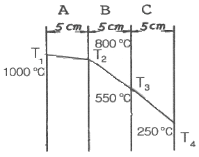 인 3개의 평판이 서로 밀착되어 복합체를 이루고 있다. 정상 상태에서의 온도 분포가 그림과 같을 때, 어느 물질의 열전도도가 가장 작은가? (단, 온도