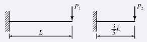 재질과 단면이 같은 다음 2개의 외팔보에서 자유단의 처짐을 같게 하는 \frac{P_1}{P_2} 의 값은?
