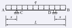 그림과 같이 단순지지된 보에 등분포하중 q가 작용하고 있다. 지점 C의 부모멘트와 보의 중앙에 발생하는 정모멘트의 크기를 같게 하여 등분포하중 q의 크기를 제한하려고 한다. 지점 C와 D는 보의 대칭거동을 유지하기 위하여 각각 A와 B로부터 같은 거리에 배치하고자 한다. 이때 보의 A점으로부터 지점 C의 거리 X는?