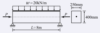 경간이 8m인 PSC보에 계수등분포하중(w)이 20kN/m작용할 때 중앙 단면 콘크리트 하연에서의 응력이 0이 되려면 강재에 줄 프리스트레스 힘(P)은? (단, PS강재는 콘크리트 도심에 배치되어 있다.)
