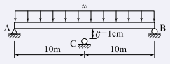 그림과 같이 길이 20m인 단순보의 중앙점 아래 1cm 떨어진 곳에 지점 C가 있다. 이 단순보가 등분포하중