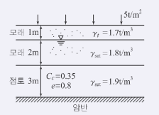 그림과 같은 지층단면에서 지표면에 가해진 5t/m²의 상재하중으로 인한 점토층(정규압밀점토)의 1차 압밀최종침하량(S)을 구하고, 침하량이 5cm일 때 평균압밀도(U)를 구하면?