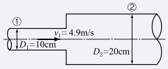 아래 그림과 같이 지름 10cm인 원 관이 지름 20cm로 급확대되었다. 관의 확대 전 유속이 4.9m/s라면 단면 급확대에 의한 손실수두는?