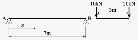 연행하중이 절대최대휨모멘트가 생기는 위치에 왔을 때, 지점 A에서 하중 10kN까지의 거리(