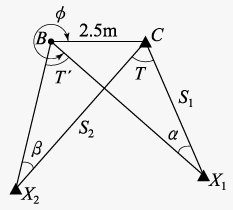 삼각점 C에 기계를 세울 수 없어서 2.5m를 편심하여 B에 기계를 설치하고 T'=31°15′40″를 얻었다면 T는? (단, \phi =300°20′, S_1=2km, S_2=3km)