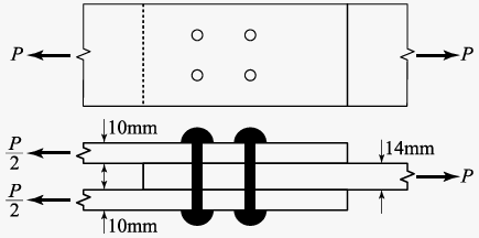 그림과 같은 강재의 이음에서 P=600kN이 작용할 때 필요한 리벳의 수는? (단, 리벳의 지름은 19mm, 허용전단응력은 110MPa, 허용지압응력은 240MPa이다.)
