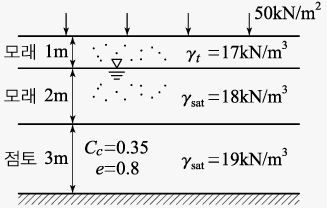그림과 같은 지층단면에서 지표면에 가해진 50kN/m²의 상재하중으로 인한 점토층(정규압밀점토)의 1차압밀 최종침하량(S)을 구하고, 침하량이 5cm일 때 평균압밀도(U)를 구하면? (단,