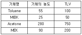 금속도장 작업장의 공기 중에 혼합된 기체의 농도와 TLVTLV\mathrm{TLV}가 다음 표와 같을 때, 이 작업장의 노출지수(EIEI\mathrm{EI})는 얼마인가?(단, 상가 작용 기준이며 농도 및 TLVTLV\mathrm{TLV}의 단위는 ppmppm\mathrm{ppm}이다.)