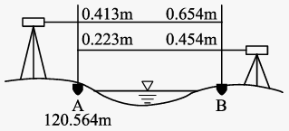 교호 수준 측량을 하여 다음과 같은 결과를 얻었다. A점의 표고가 120.564m이면 B점의 표고는?