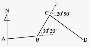 \overline{AB} 측선의 방위각이 50°30′이고 그림과 같이 각 관측을 실시하였다. \overline{CD} 측선의 방위각은?