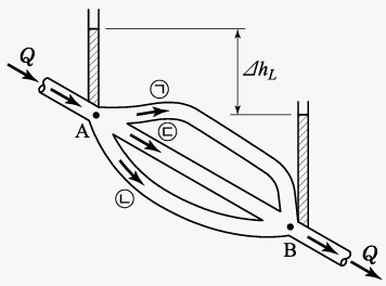 그림과 같은 병렬관수로 ㉠, ㉡, ㉢에서 각관의 지름과 관의 길이를 각각
