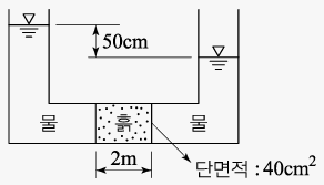 그림에서 흙의 단면적이 40cm²이고 투수계수가 0.1cm/sec일 때 흙 속을 통과하는 유량은?