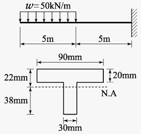 T형 단면의 캔틸레버 보에서 최대 전단응력은? (단, T형보 단면의