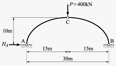 그림과 같은 3힌지 아치의 C점에 연직하중(P) 400kN이 작용한다면 A점에 작용하는 수평반력(
