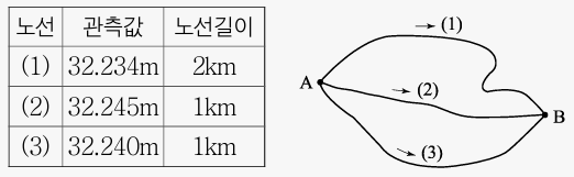A, B 두 점 간의 비고를 구하기 위해 (1), (2), (3)경로에 대하여 직접고저측량을 실시하여 다음과 같은 결과를 얻었다. A, B 두 점간의 고저차의 최확값은?