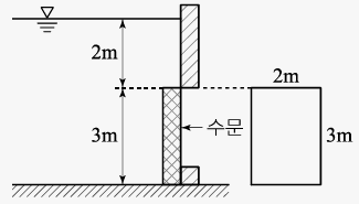 그림과 같이 물속에 수직으로 설치된 넓이 2m×3m의 수문을 올리는 데 필요한 힘은? (단, 수문의 물속 무게는 1960N이고, 수문과 벽면사이의 마찰계수는 0.25이다.)