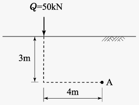 그림과 같이 지표면에 집중하중이 작용할 때 A점에서 발생하는 연직응력의 증가량은?