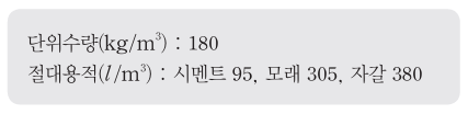다음은 특정 콘크리트의 절대용적배합을 나타낸 것이다. 이 콘크리트의 물시멘트비는? (단, 시멘트의 밀도는 3.15[g/cm3]3.15[g/cm^3]이다.)